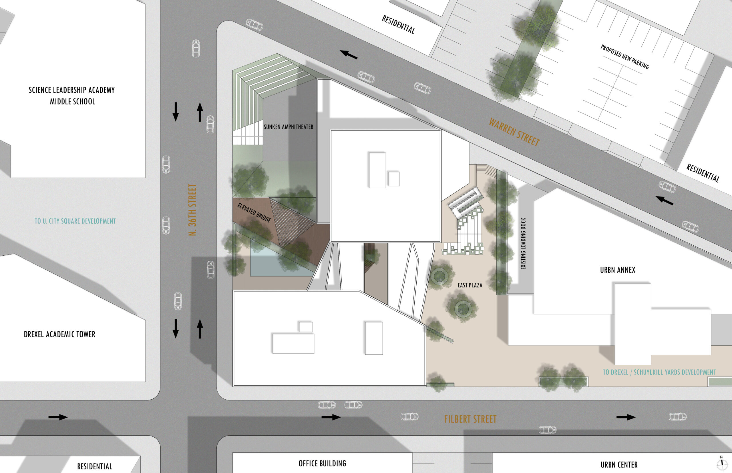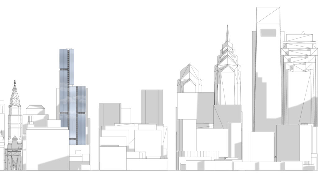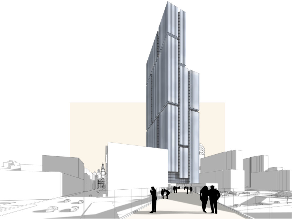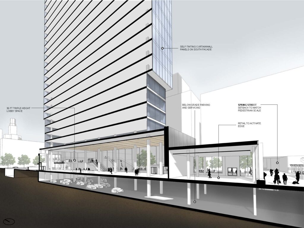 Ground level retail activates the street edge with point of entry into the buildings from a newly created plaza core. A proposed elevated pedestrian bridge spans over the dangerous Vine Street Expressway, creating a safe means of entry into the site and Center City from the residential neighborhoods north of it. While a master plan was proposed, the office and hotel tower was developed for this project.